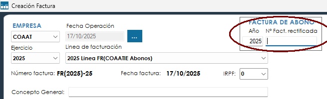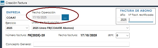 La fecha de operación nos permite, ¡por cada línea de facturación!, emitir una factura con fecha anterior (y solo anterior) a la actual. El programa, además, controlará cual fue la última fecha emitida, no dejando emitir con fecha anterior a esa. Lo podremos editar en la opción marcada en la imagen inferior.