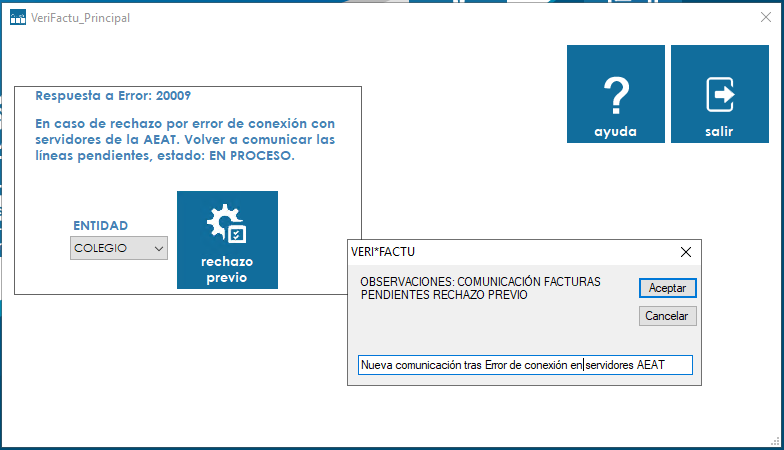 En este caso existe un error en los servidores de la AEAT, debemos emitir nuevamente el registro, (CUANDO SE RESTABLEZCA EL SERVICIO). Utilizando la opción <Rechazo Previo>