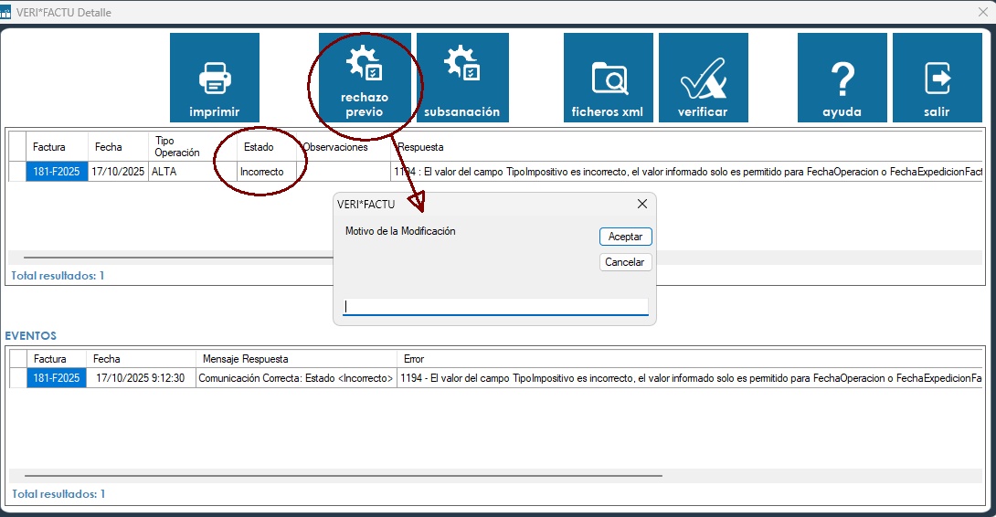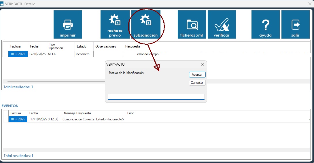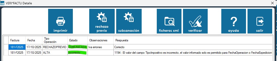 En el caso de que al emitir una factura esta haya sido ACEPTADA por AEAT pero nos indique algún error. Podemos volver a emitir una comunicación sobre esta misma factura para arreglar dicho error.