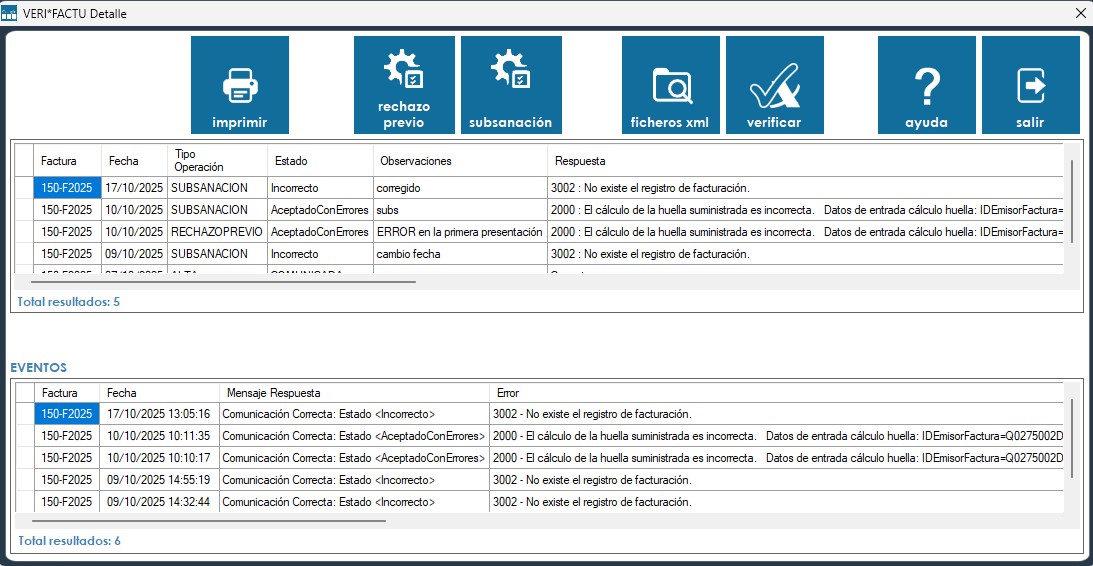 En la parte inferior del formulario queda almacenado también los eventos ocurridos para cada factura. Leídos directamente del XML de respuesta de AEAT, los cuales servirán para verificar dicha comunicación.